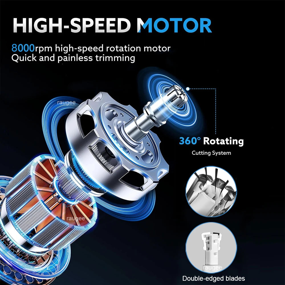 【Safe & Efficient】 The trimmer features a dual-edge stainless steel blade system with an internal 360° rotation design, ensuring efficient cutting, painless operation, and no leftover hair, allowing for easy breathing.